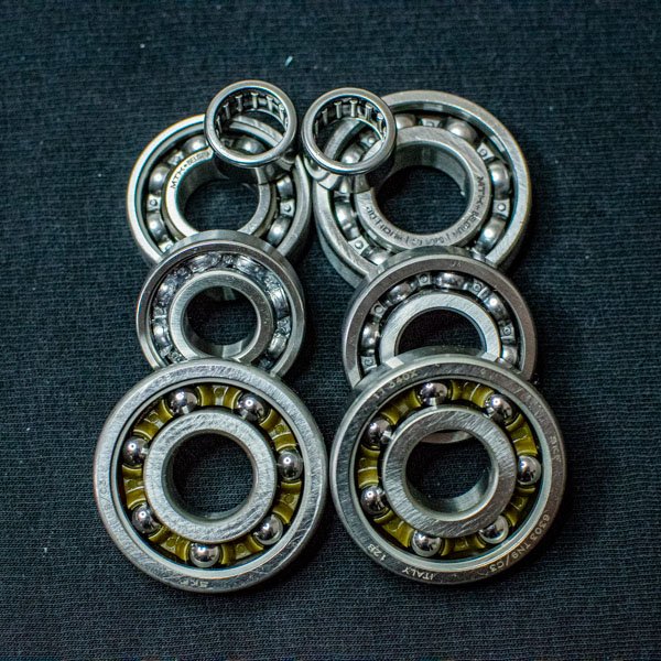 En este caso se trata de rodamientos de bolas sin tapas, con jaula de acero y una tolerancia especifica para cada área del motor. Por ejemplo todos los rodamientos con tolerancia C3 están pensados para un funcionamiento a altas revoluciones, como puede ser el cigüeñal o el eje de balances. En cambio los demás están pensados para trabajar a menos revoluciones como la caja de cambios. Esto se traduce en un mejor rendimiento del motor y una mayor vida útil.