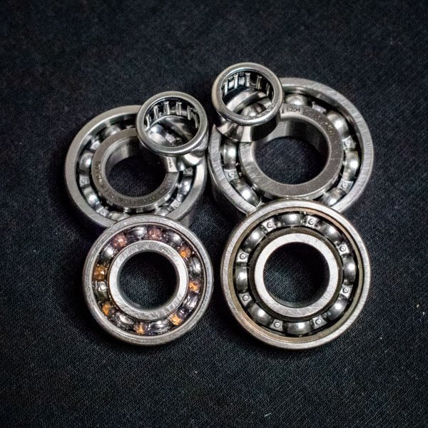 En este caso se trata de rodamientos de bolas sin tapas, con jaula de acero y una tolerancia especifica para cada área del motor. Por ejemplo todos los rodamientos con tolerancia C3 están pensados para un funcionamiento a altas revoluciones, como puede ser el cigüeñal o el eje de balances. En cambio los demás están pensados para trabajar a menos revoluciones como la caja de cambios. Esto se traduce en un mejor rendimiento del motor y una mayor vida útil.