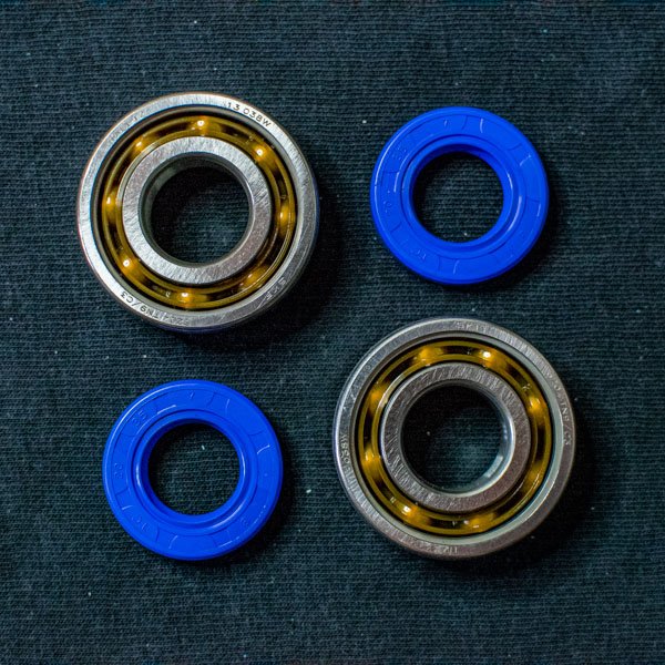 En este caso se trata de rodamientos de bolas sin tapas, con jaula de poliamida y una tolerancia C3, ideales para soportar las altas revoluciones del cigüeñal gracias a su menor fricción y excelente resistencia a altas temperaturas. Esto se traduce en un mejor rendimiento del motor y una mayor vida útil.