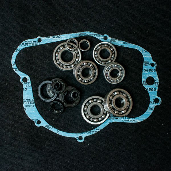 En este caso se trata de rodamientos de bolas sin tapas, con jaula de acero y una tolerancia especifica para cada área del motor. Por ejemplo todos los rodamientos con tolerancia C3 están pensados para un funcionamiento a altas revoluciones, como puede ser el cigüeñal o el eje de balances. En cambio los demás están pensados para trabajar a menos revoluciones como la caja de cambios. Esto se traduce en un mejor rendimiento del motor y una mayor vida útil.